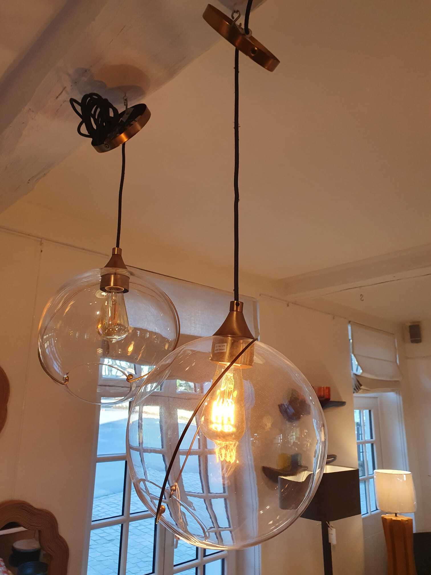 paire de suspensions en verre sur structure laiton suspension en verre soufflé sur structure laiton, diamètre 28cm, hauteur réglable 740€ 518€